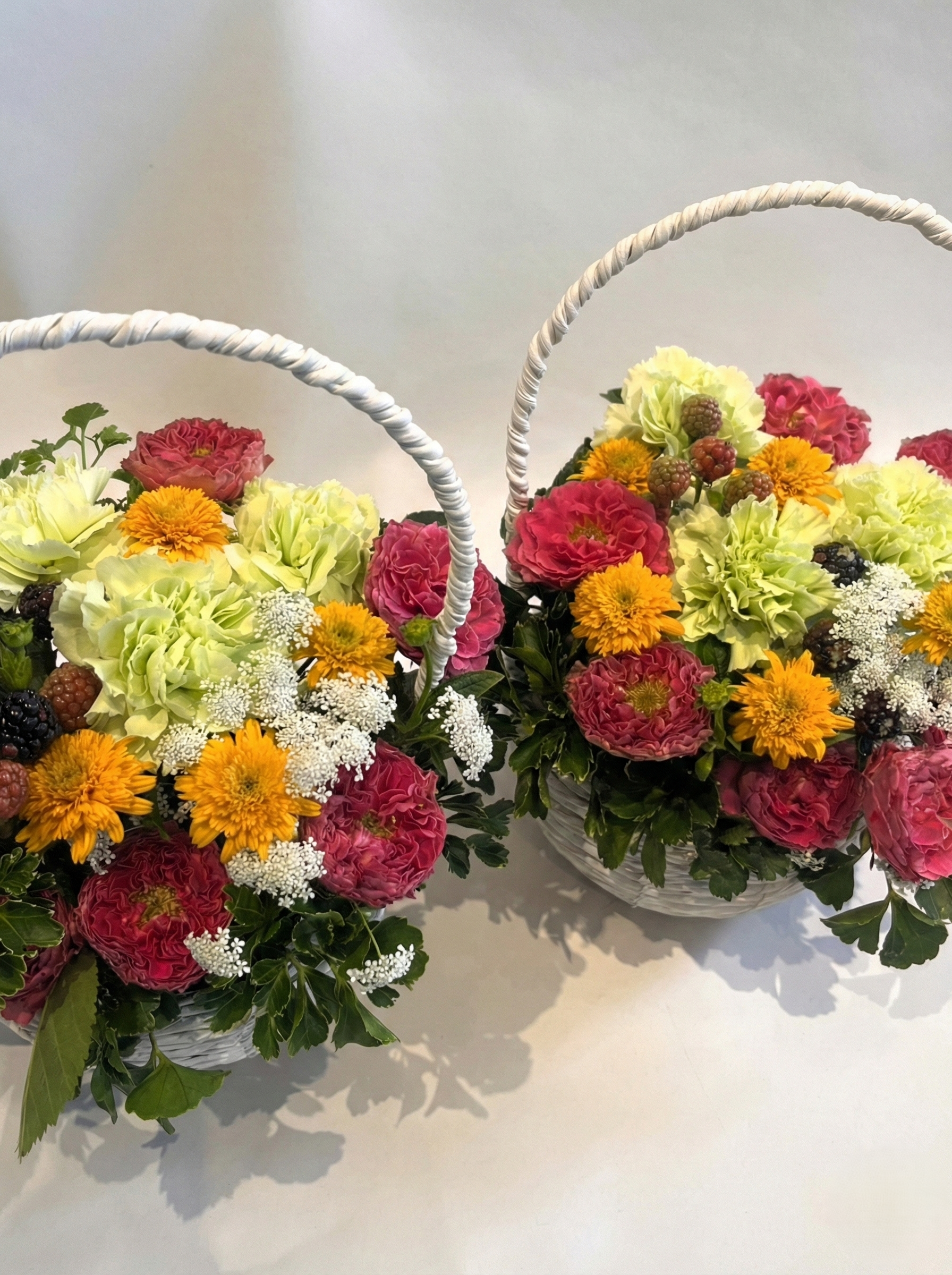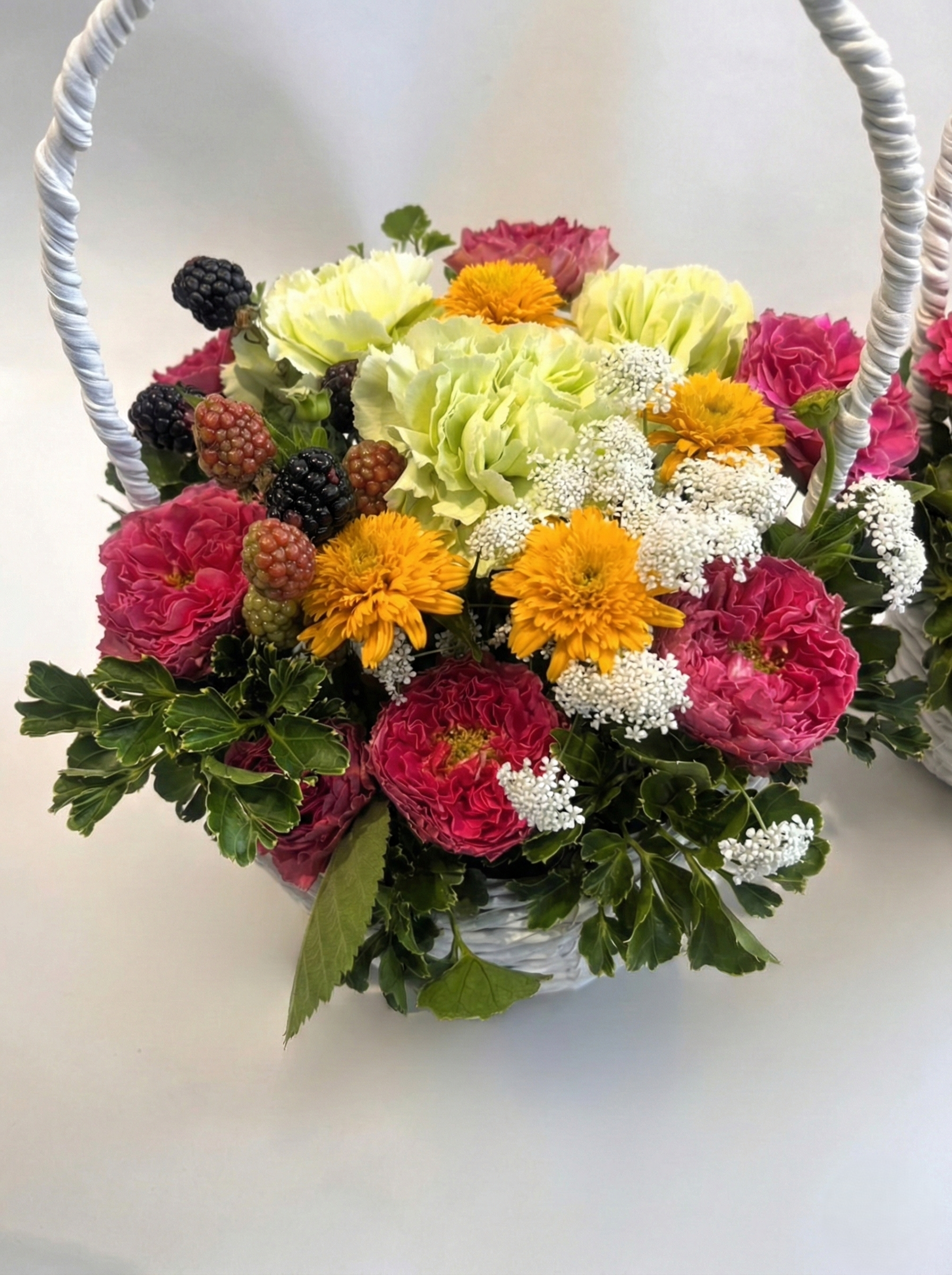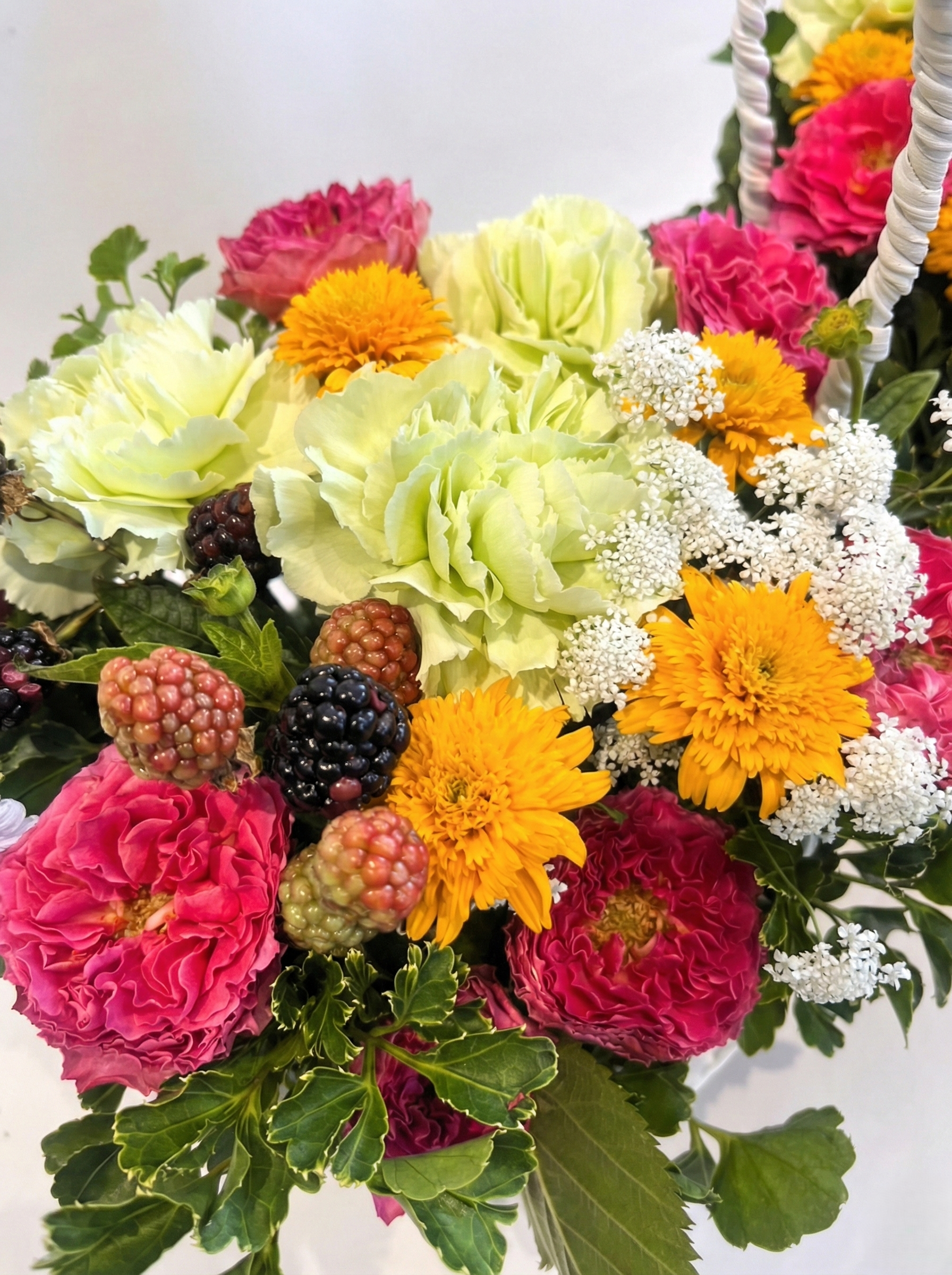 取っ手のついたバスケットにお花畑みたいなアレンジをお作りします。